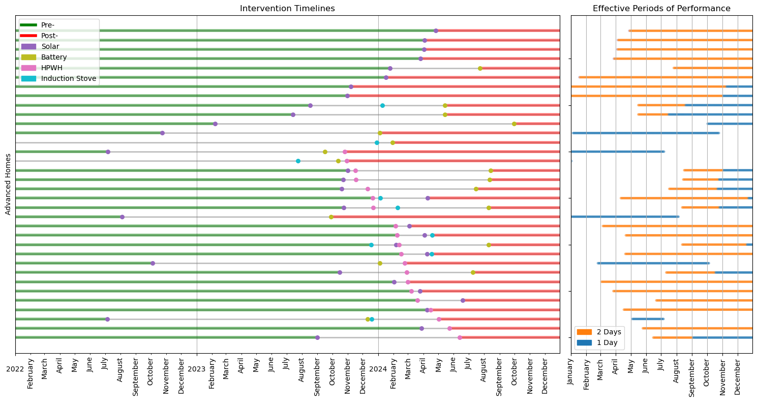 Figure 3: The sub-plot at left depicts the timelines of completed AH program interventions for each participant household. The corresponding periods of performance are plotted for each, with pre- (Green) and post- (Red) implementation dates labeled. The sub-plot to the right illustrates the effective overlap between the pre-and-post periods, in terms of the numbers of corresponding dates (1 - Blue, 2 - Orange) as a series of labeled timelines.
