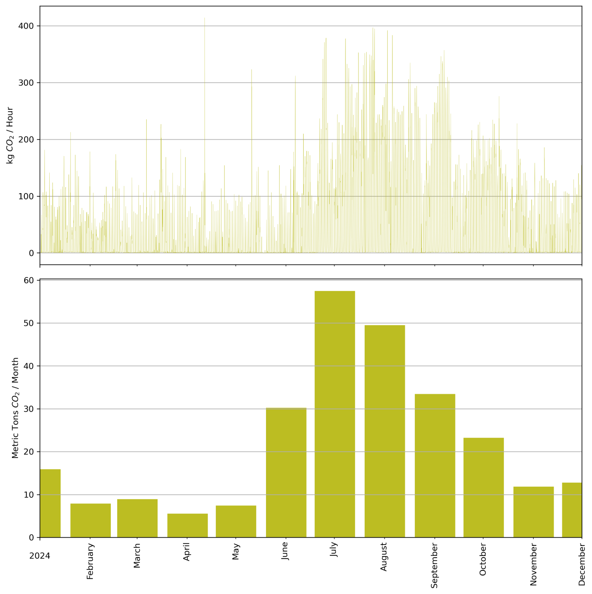 Figure 30 below plots the avoided GHG emissions (in CO2 equivalents) attributable to the modeled BAAEC system’s output for 2024, aggregated at an hourly (top) and monthly (bottom) interval. The avoided emissions estimates were computed by matching the hourly modeled output of the BAAEC systems to the marginal GHG emissions intensity factors for each corresponding hour obtained from data provider WattTime through the SGIP program.
