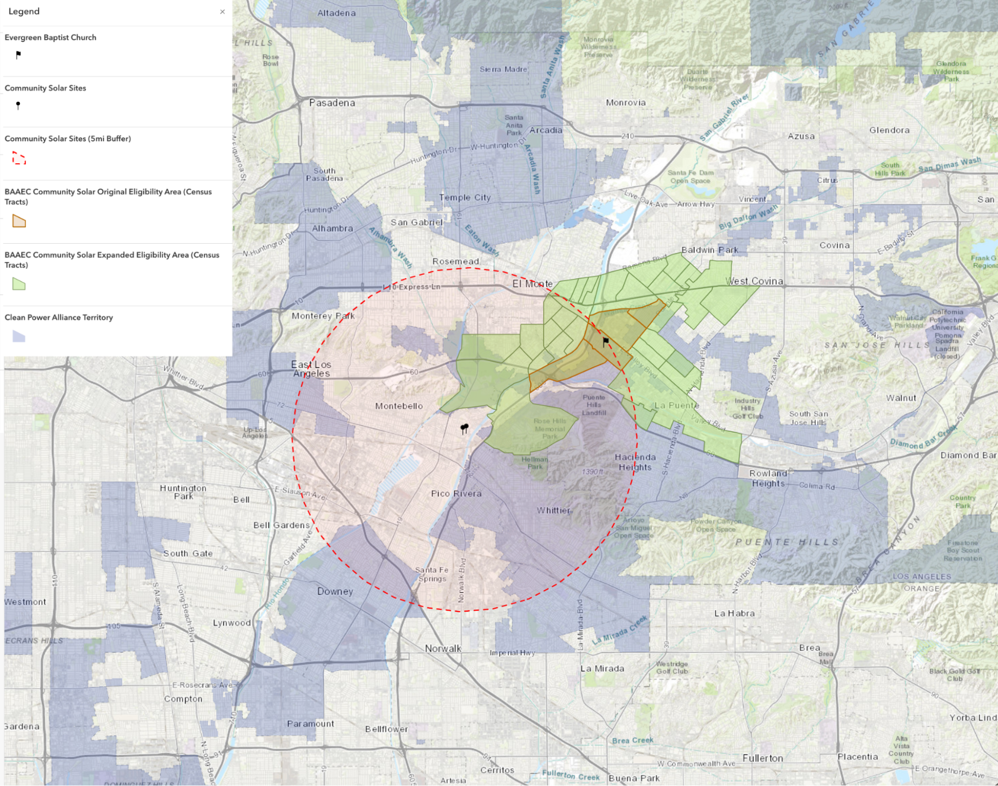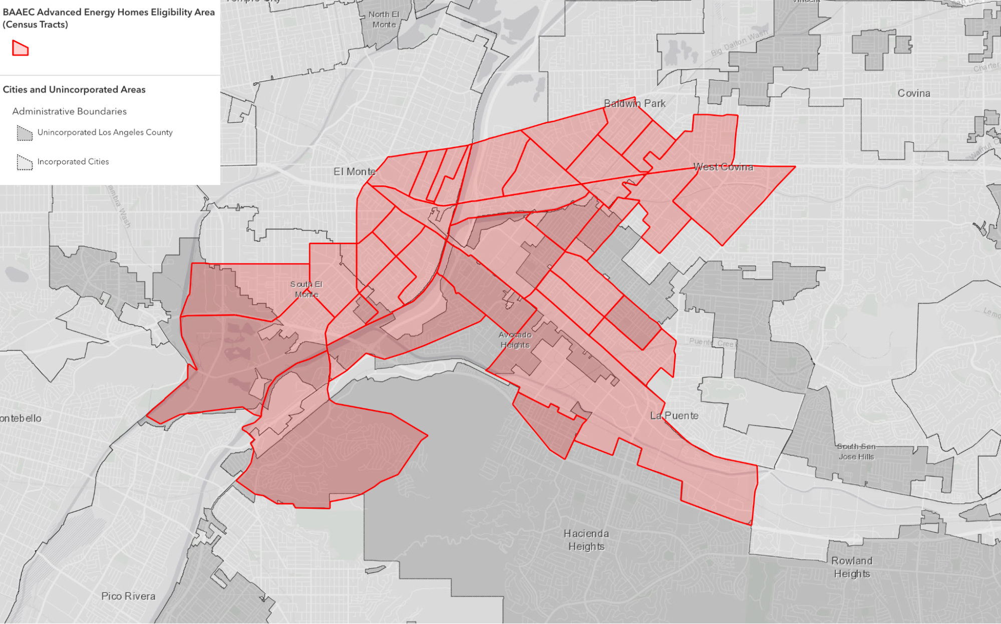 The initial AH program design called for a geographic eligibility area that was restricted to a group of 4 contiguous DAC census tracts located within the Los Angeles County Unincorporated communities of Basset & Avocado Heights. However, due to challenges that were encountered in the recruitment of participants throughout the course of the project’s implementation phase it was decided, in conjunction with CEC, that this eligibility area be expanded to include 33 additional census tracts (for a total of 37) located within one mile of the original set of 4. Figure 1 shows a map of this final eligibility area relative to local municipal boundaries.