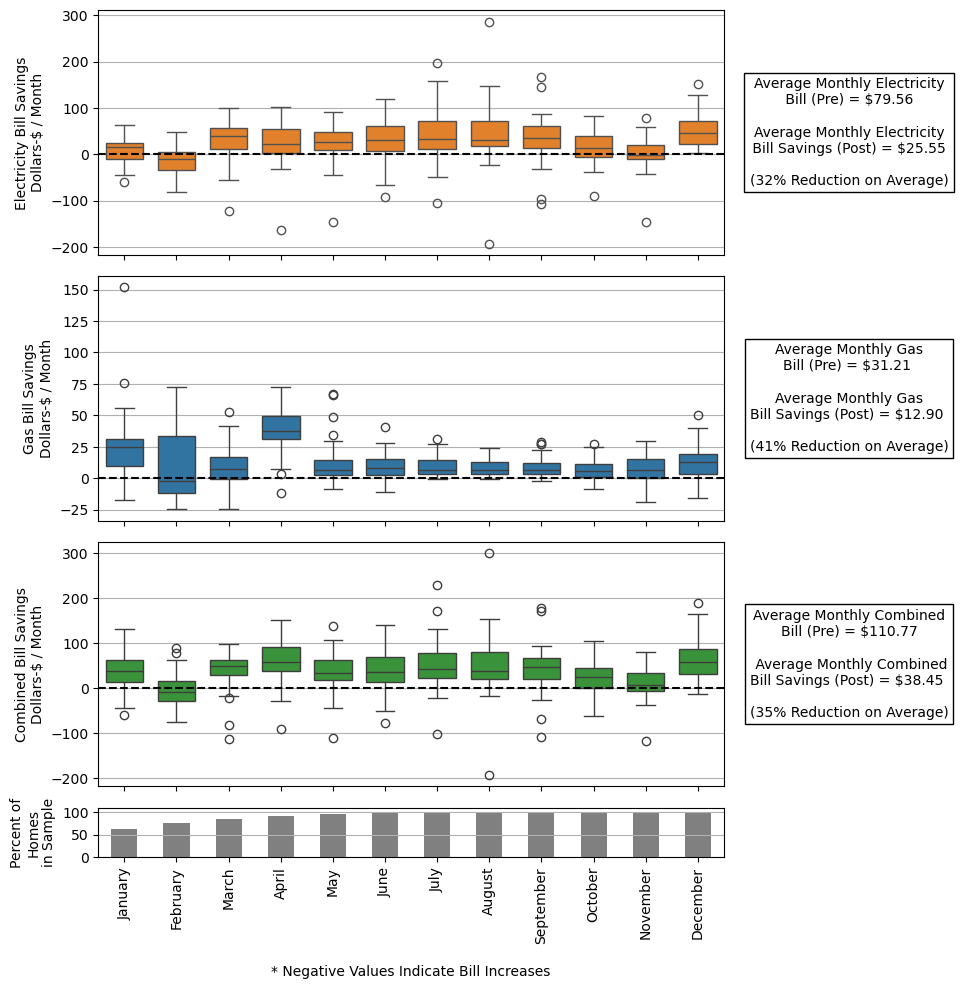 One feature of note in Figure 5 is the high degree of variability in the monthly gas and electricity consumption levels among AH program cohort households. A portion of this variation can likely be explained by differences in the effective occupancy levels (which were not controlled for) among the homes as well as potential differences in individual preferences/demands for various types of electricity and gas end-use energy services. Another feature of Figure 5 worth noting is that the staggered implementation of different load modifying measures, several of which have strong seasonal effects, need to be taken into account when attempting to evaluate program performance for the full participant cohort. For most of the program participants, the first measure which they received was a rooftop solar PV system, followed later by the potential addition of new electrical loads (HPWHs and/or induction stoves) and ultimately, the installation of a BESS. Variability in the timing and sequencing of these interventions among the participants, which is an unavoidable reality in the implementation of this type of program, makes it challenging to assess the comprehensive effects of the technologies on household energy consumption and expenditures, particularly during the intermediate periods before all of the measures were implemented. We encourage the reader to take note of this feature of the program’s implementation when interpreting these and subsequent findings.