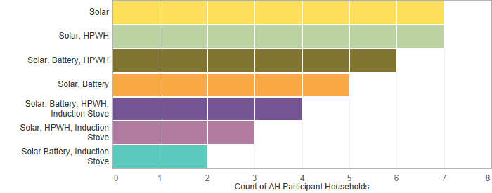 In addition to the PV and BESS system offerings, two additional measures were available to participants. These included the installation of a new heat-pump water heater from Rheem and an induction combo stove and range from Frigidaire. Supplemental funding to support the purchase and installation of the heat pump water heaters was obtained through the TECH Clean California program, and funding for the purchase of the induction stoves was sourced through a collaboration with the Los Angeles Clean Tech Incubator (LACI). Table 1 below documents each of these available measures, including descriptions of the specific technologies used, as well as the total number of households in the AH participant cohort who opted for each. Figure 2 depicts the numbers of households within the cohort that adopted different unique combinations of these measures.