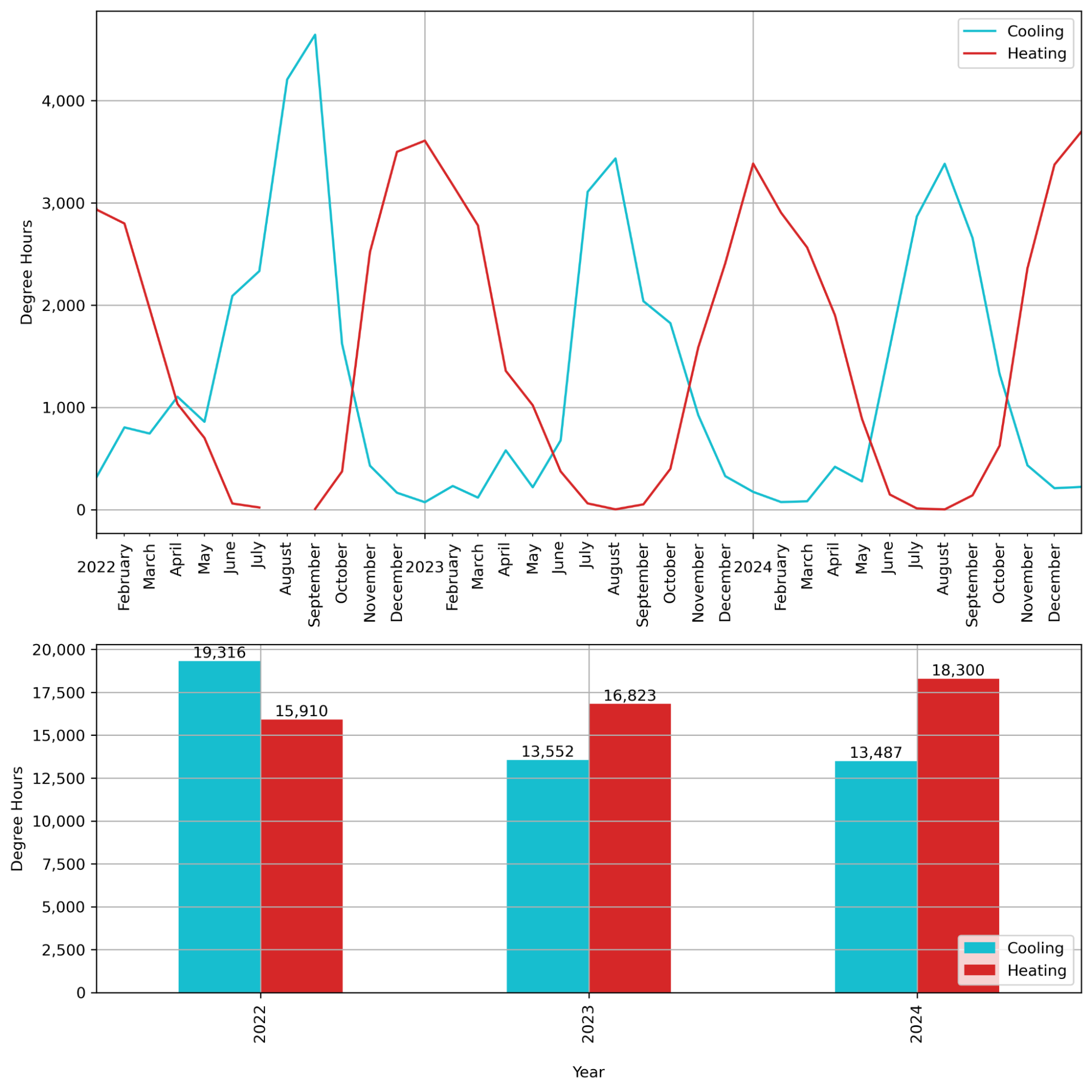 Historical weather data were obtained using the open source eeweather python package. This package provides a simple application programmatic interface (API) for downloading historical weather and climate data from official repositories to support energy efficiency program analysis. Using the eeweather API, hourly temperature data were obtained for 2022/01/01 - 2024/12/31 from the National Centers for Environmental Information (NCEI) Integrated Surface Database (ISD). These data were sourced from the nearest available ISD weather station (ISD 722976), which is located at Fullerton Municipal Airport, approximately 12 miles from the AH program’s eligibility area.
