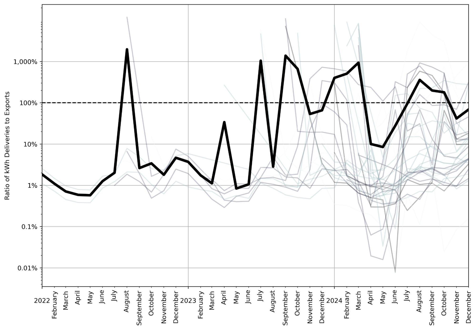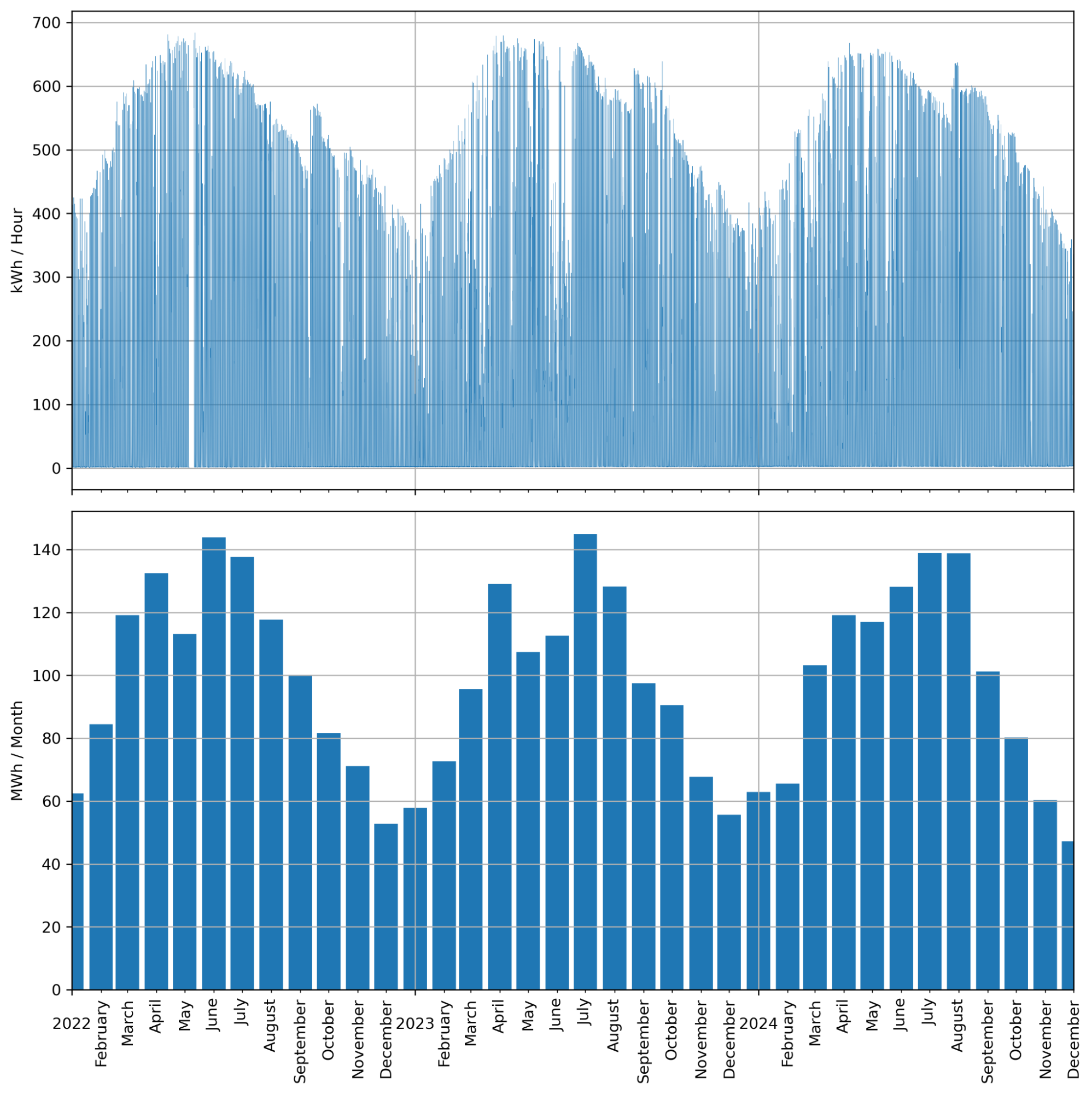The solid black vertical line illustrates the total annual consumption that would be expected by multiplying the CPA’s 408 kWh / month average customer usage level by the total number of customers enrolled in the program (n = 360) and the total number of months in the program’s period of performance (12). By comparison, the broken vertical plots the total annual output in 2024 for the model’s BAAEC system based upon a scaling of another local proxy system’s actual measured hourly output.