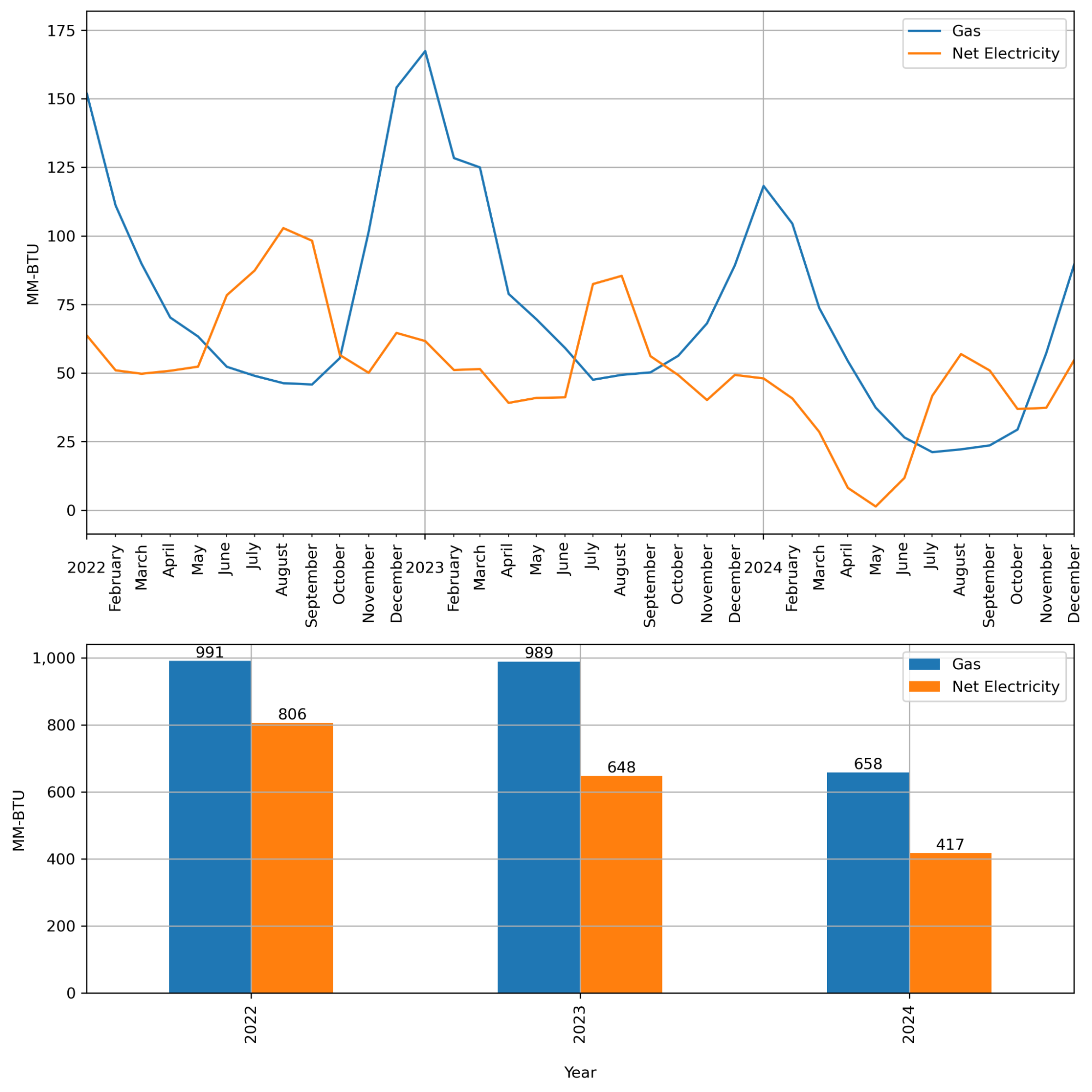 Figure 4. Monthly and annual total gas and net electricity consumption for the entire AH cohort expressed in common energy units (MM-BTU).