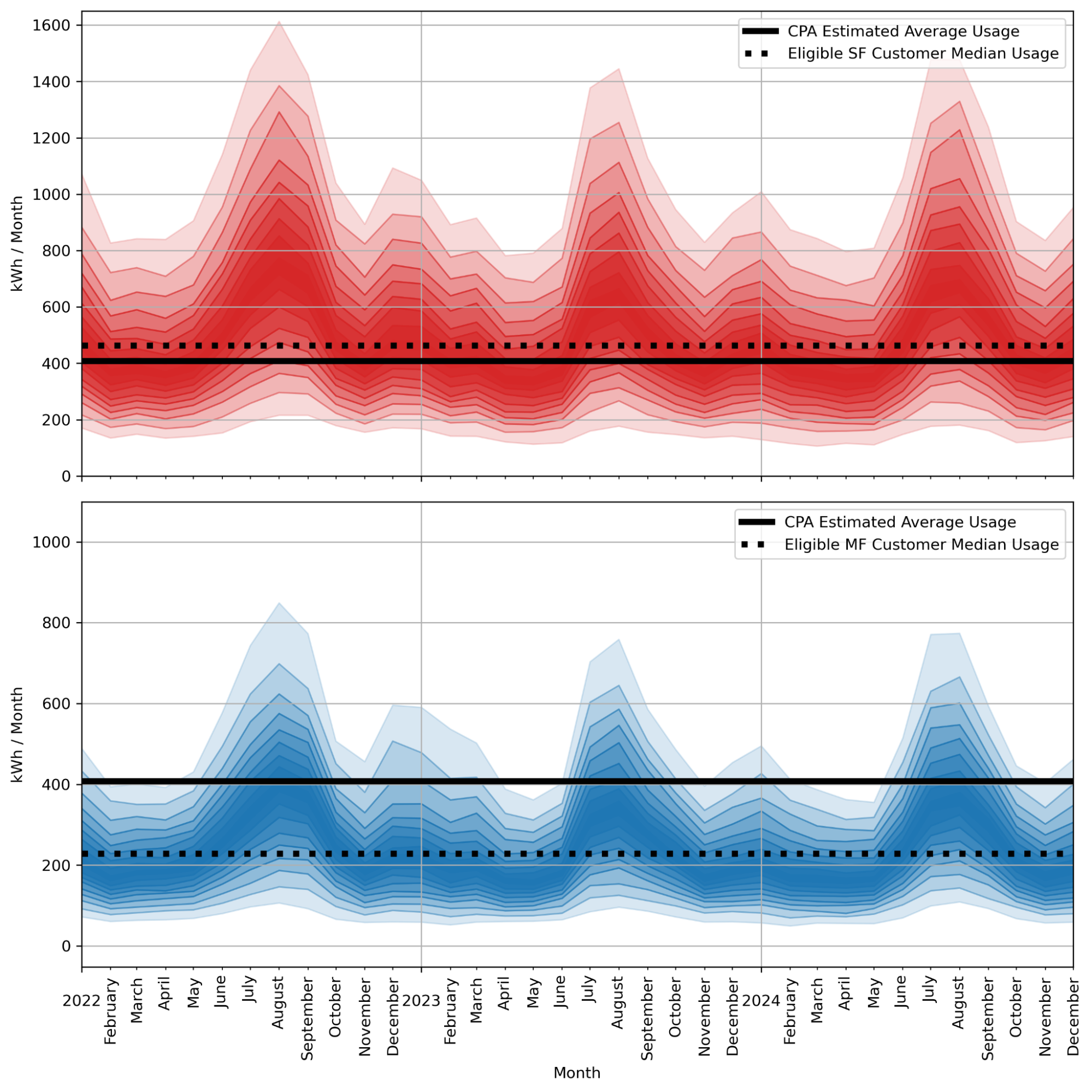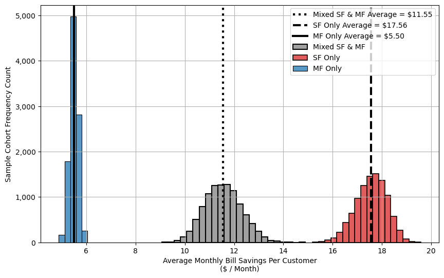The gray histogram illustrates the range of annual usage totals that would be expected from 10,000 sampled customer cohorts for which no categorical filters were applied. Thus, the gray histogram can be thought of as representing cohorts made up of a mixture of both SF and MF customers, in different ratios. Alternatively, the red and blue histograms depict the range of annual total usage values derived from 10,000 sampled customer cohorts that were restricted to SF and MF customers only, respectively. The differences in the distribution of usage values for each of these histograms reflects the significant differences in both the average and range of monthly usage values among SF and MF customers within the BAAEC project’s eligibility area.