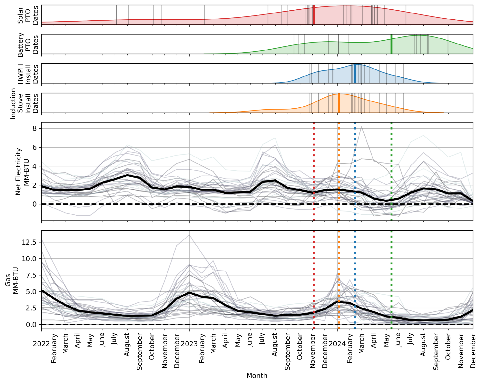 Figure 5. Granular time series plots of individual AH participant household net electricity and gas usage relative to the timing of implementation of different AH program measures. Average household usage rates are plotted as a thick black line relative to each usage time series. Likewise, the median dates of completion for each measure category are plotted as thick colored vertical lines, relative to each measure time series. These median dates are extended as broken lines relative to each usage time series for context. Negative electricity usage values indicate net-exports of power back to the grid.
