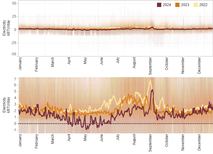Even when taking these important caveats into account, significant reductions in both the total demand for both gas and grid supplied electricity among the AH participant cohort are evident by the end of the data availability period. For example, in the monthly data sub-plot, we can see that both the maximum monthly demand for grid electricity and the minimum monthly demand for gas in 2024 were roughly half the corresponding range of values observed in the two previous years. On the electricity side, this is likely due to the coincidence of high solar PV system outputs in warmer summer months when there are traditionally elevated cooling loads. On the gas side, the large reductions in minimum, or “baseload,” monthly gas usage likely stem from the extensive adoption of electrical heat-pump water heating units among the participant cohort. This tracks with results from the CEC’s 2019 Residential Appliance Saturation Survey (RASS) which found that water heating alone typically comprises roughly 59% of total residential gas demand, on average, statewide.5